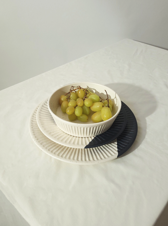 Pratos fundo pintado à mão, em faiança, com pormenor de linhas com relevo e detalhe preto.