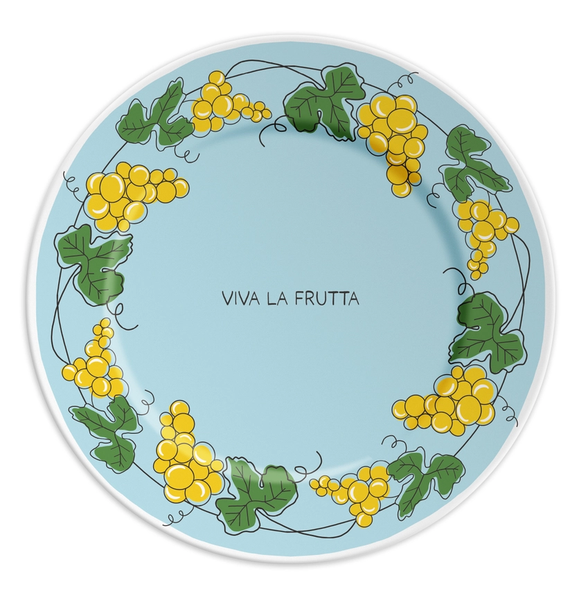 • Prato cerâmico azul com decoração de uvas amarelas e texto 'VIVA LA FRUTTA'