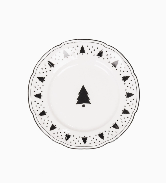 • Prato branco com padrão de árvores de Natal pretas e cinzentas