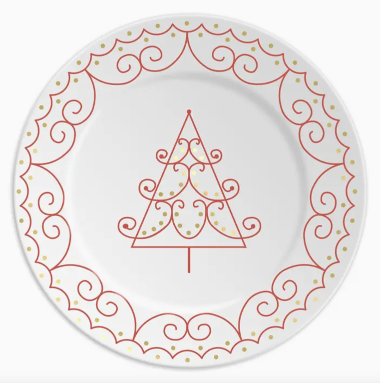 • Prato decorativo branco com árvore de Natal vermelha e padrões dourados