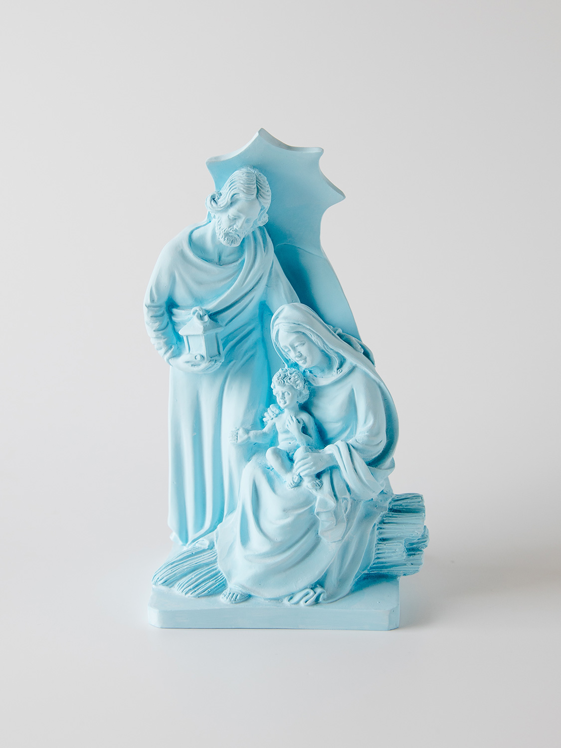 • Estátua azul da Sagrada Família com José, Maria e Menino Jesus