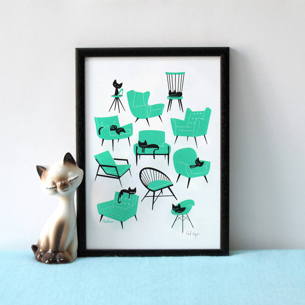 Ilustração com várias cadeiras verdes e pretas e gatos numa moldura preta ao lado de escultura de gato