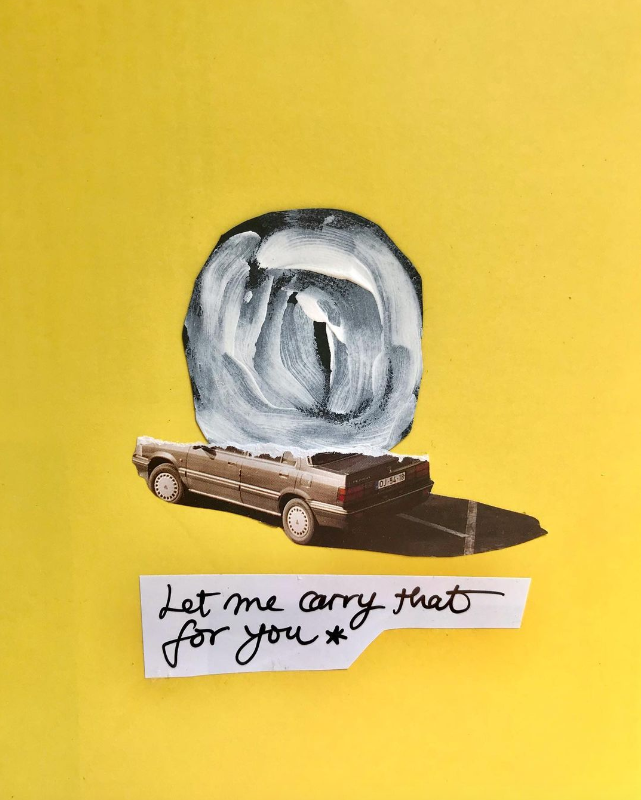 Colagem de carro bege antigo, forma abstrata branca e cinza, texto manuscrito 'Let me carry that for you *' sobre fundo amarelo