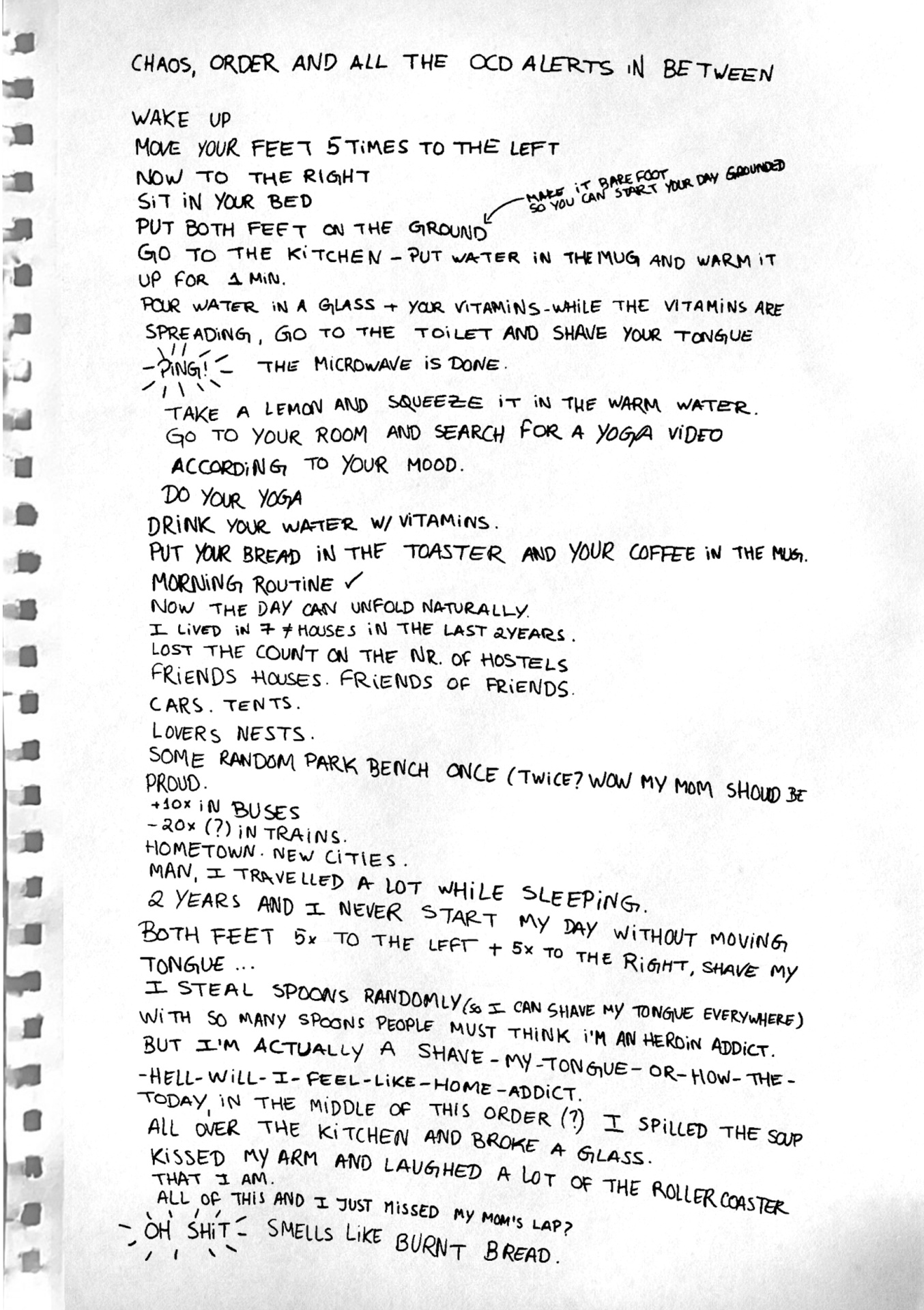 São 3h da manhã e o meu cérebro desperta. Respira fundo. Relaxa o maxilar. Dói-me o peito. Ansiedade e/ou entusiasmo? Quilómetros e quilómetros de uma cama coçada, um corpo cansado, um cérebro riscado. Caneta e papel para chegar a algum lugar. Lençóis para envolver e cobrir o dia que (ainda) não quero ver. Será que chego? Já estou.