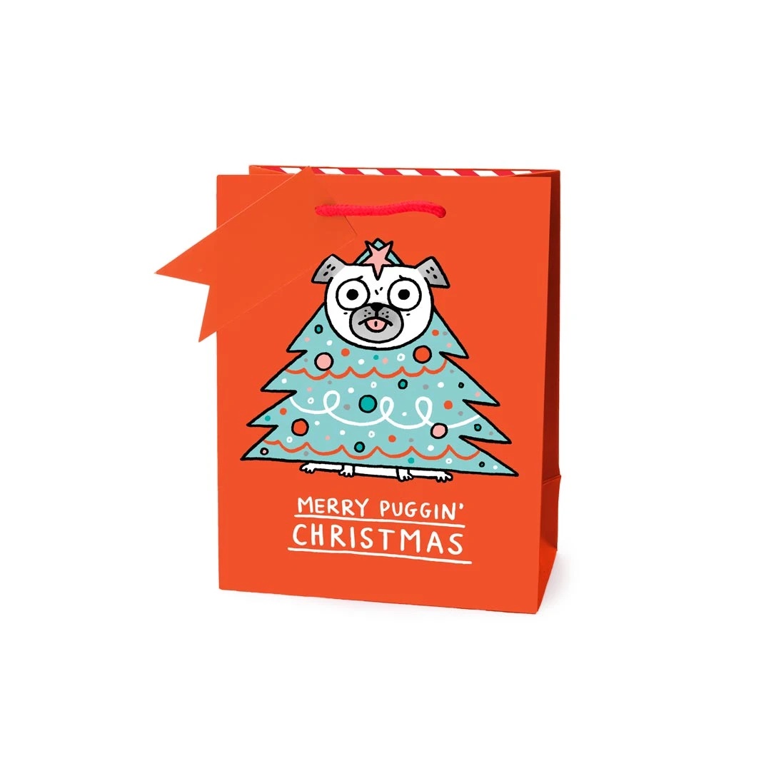 • Bolsa de presente vermelha com ilustração de cão carlino e árvore de Natal