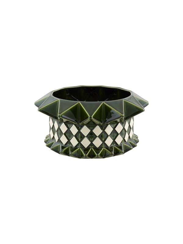 • Vaso cerâmico verde com padrão geométrico e losangos brancos