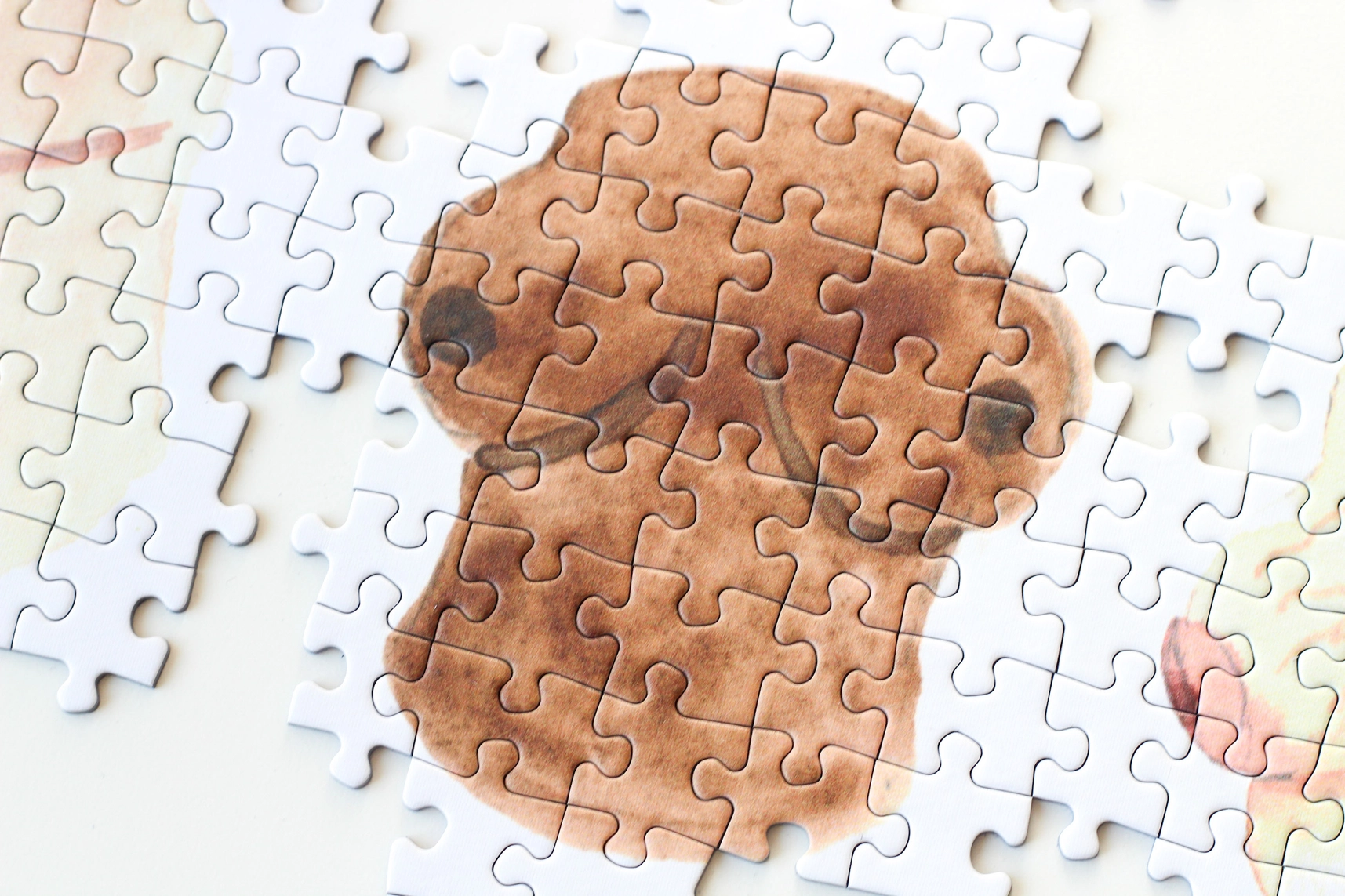 • Quebra-cabeças de imagem castanha com peças faltando sobre fundo branco.