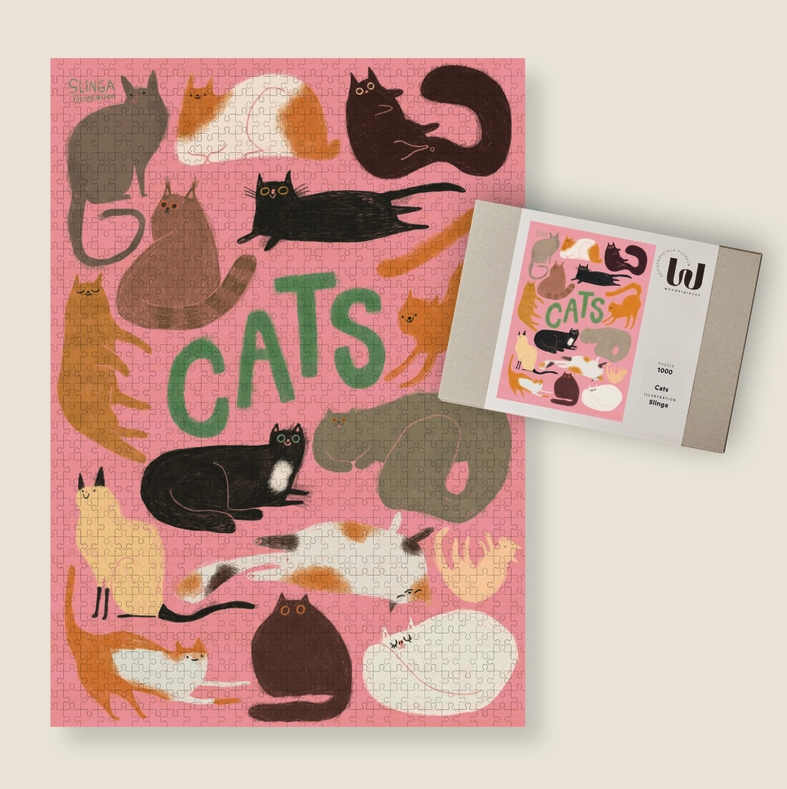 • Puzzle de 1000 peças com ilustração colorida de gatos sobre fundo rosa