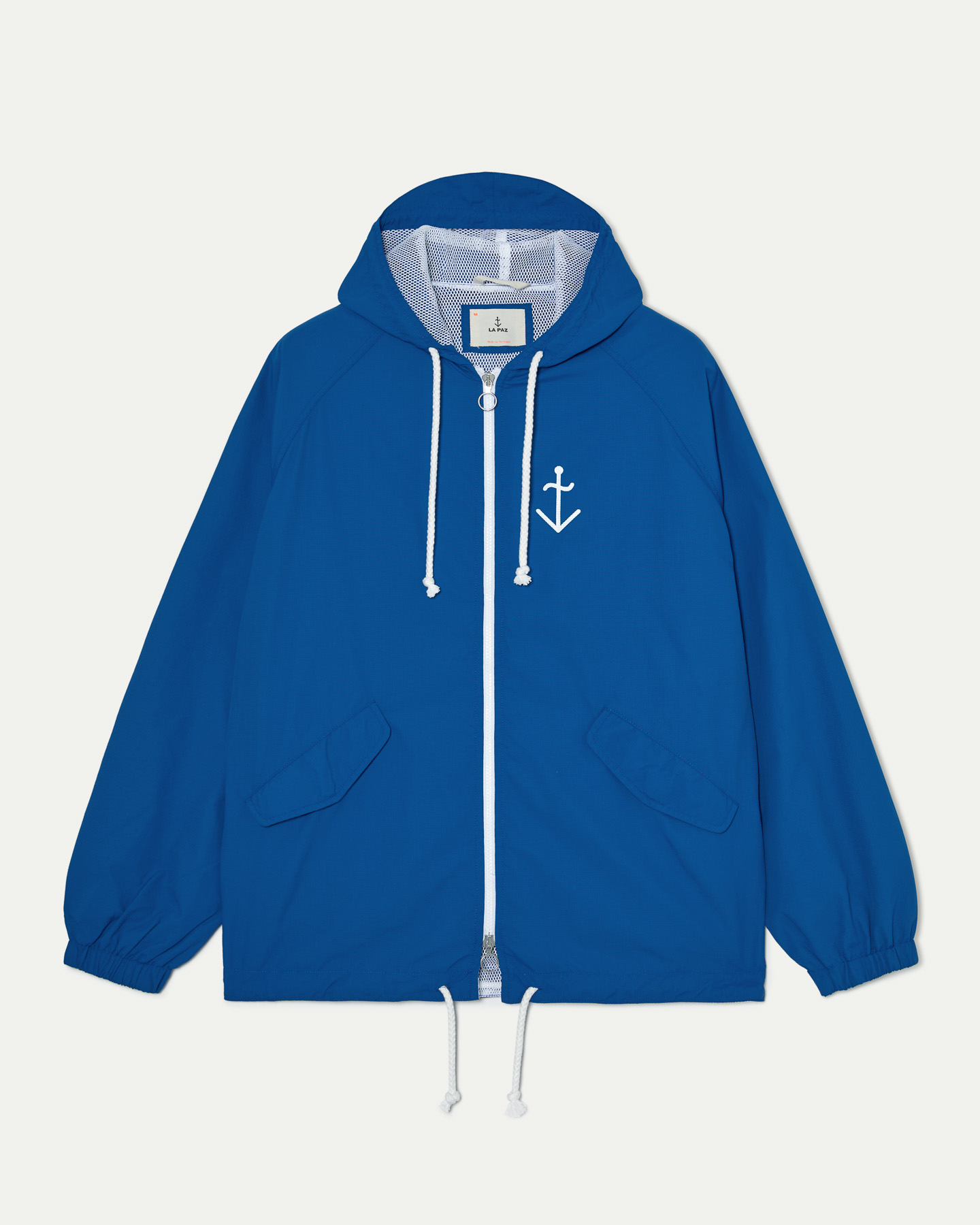 • Casaco impermeável azul com símbolo de âncora branco