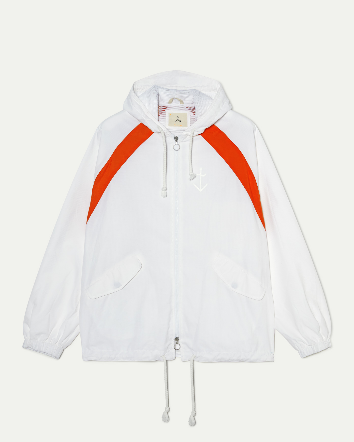 • Casaco corta-vento branco com listra laranja nos ombros e capuz com cordão.