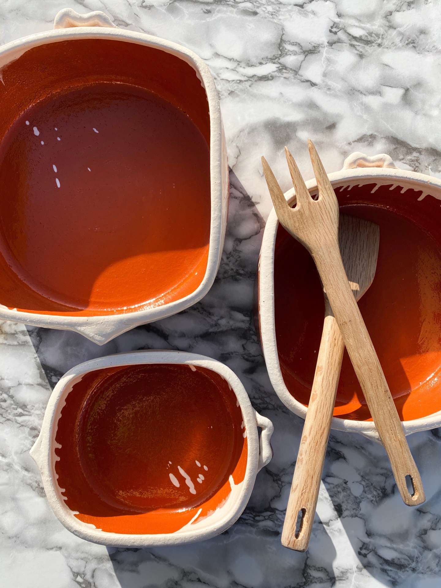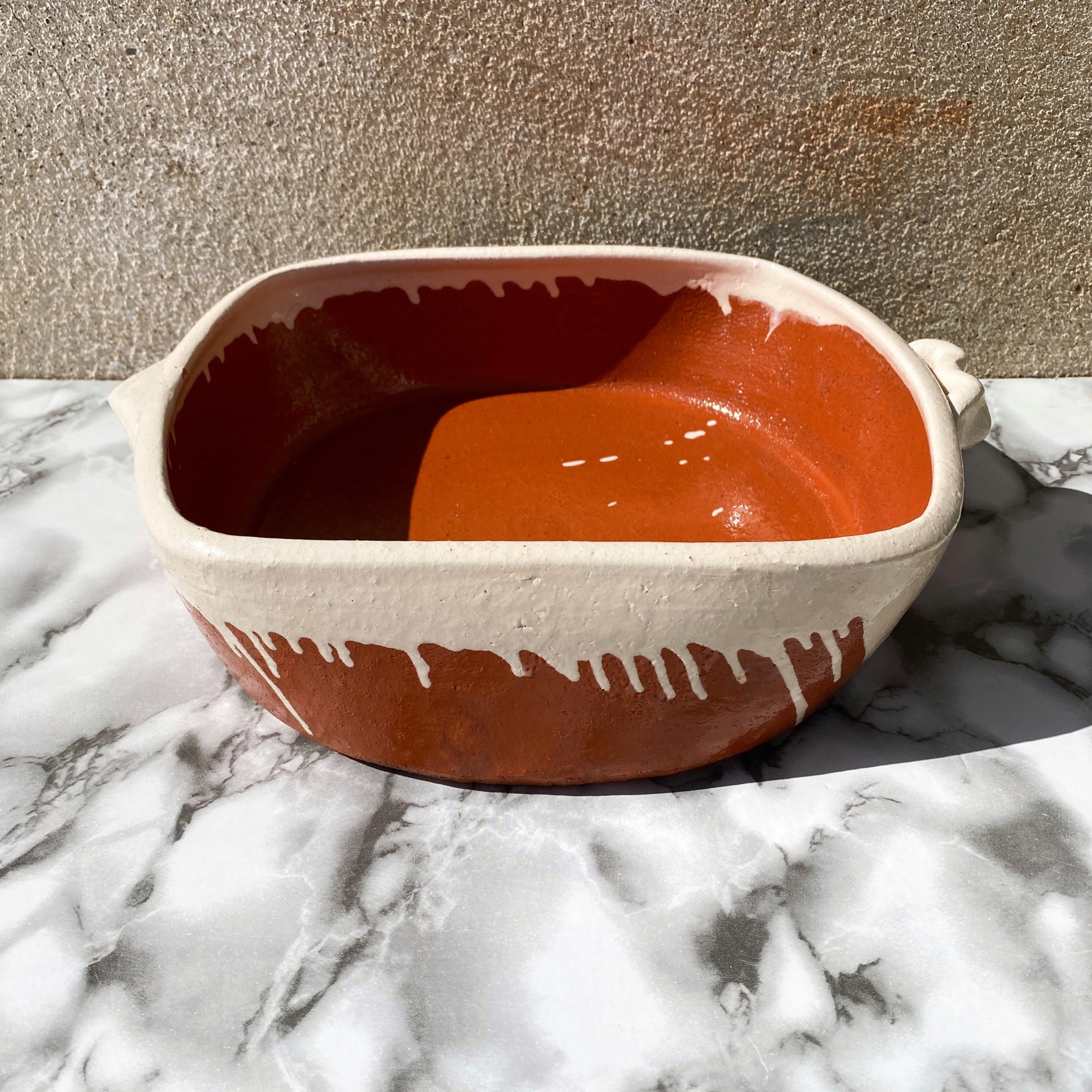 • Caçarola quadrada de cerâmica castanha avermelhada com rebordo bege