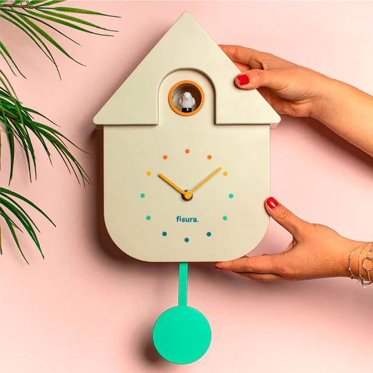 • Relógio de parede em forma de casa bege com pássaro, ponteiros e pêndulo coloridos
