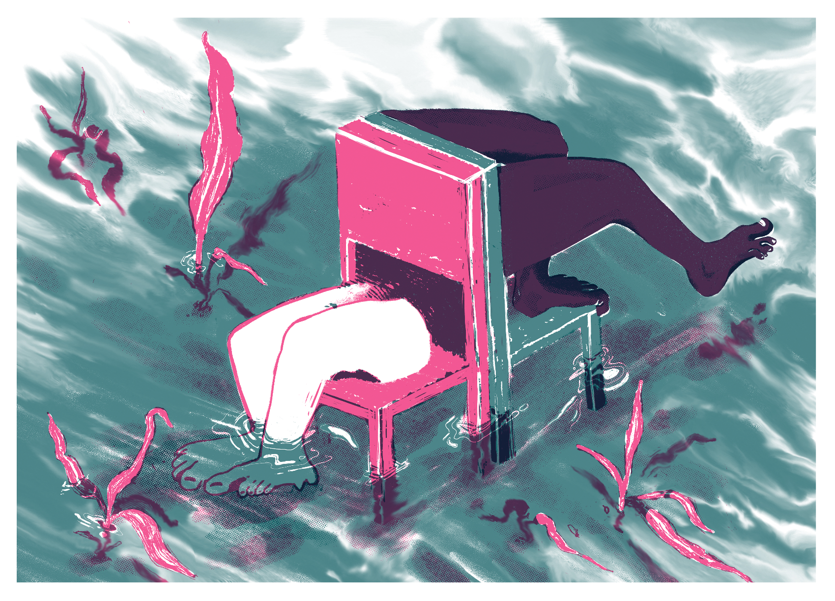 • Ilustração de cadeira rosa com pernas humanas e plantas aquáticas rosas em fundo azul esverdeado.