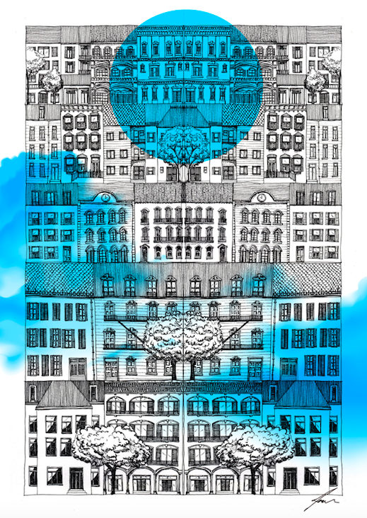 Canetas de Tinta da China (Micron Inkpen) sobre papel, com colorido e intervenções digitais.