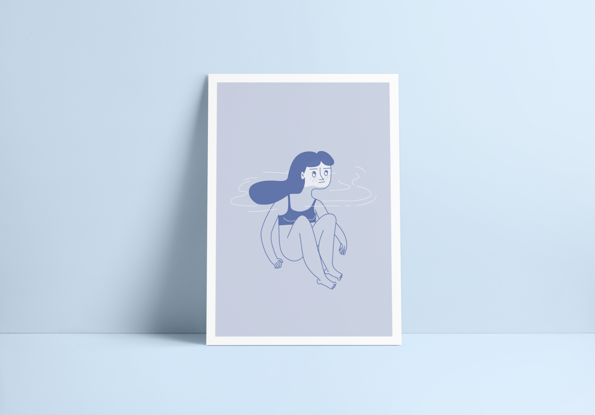 • Fotografia de póster com ilustração azul de mulher sentado, encostado a parede azul