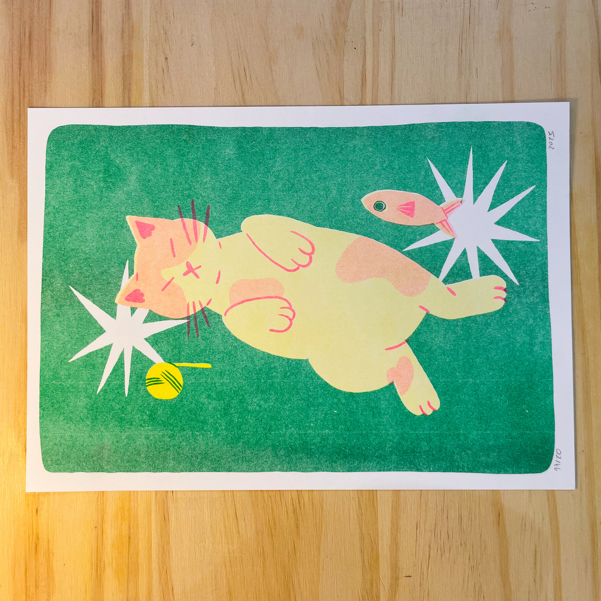 • Ilustração de gato amarelo com manchas rosa, duas estrelas brancas, uma bolinha amarela e um peixe cor-de-rosa sobre fundo verde