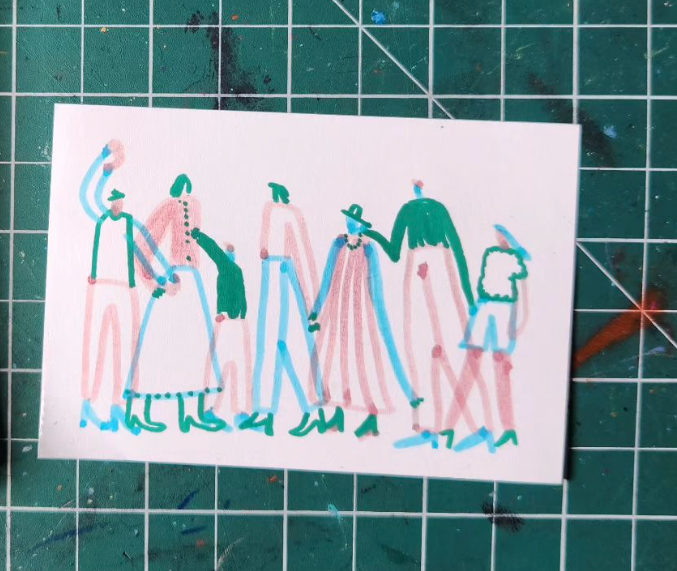Desenho minimalista de seis figuras humanas em papel