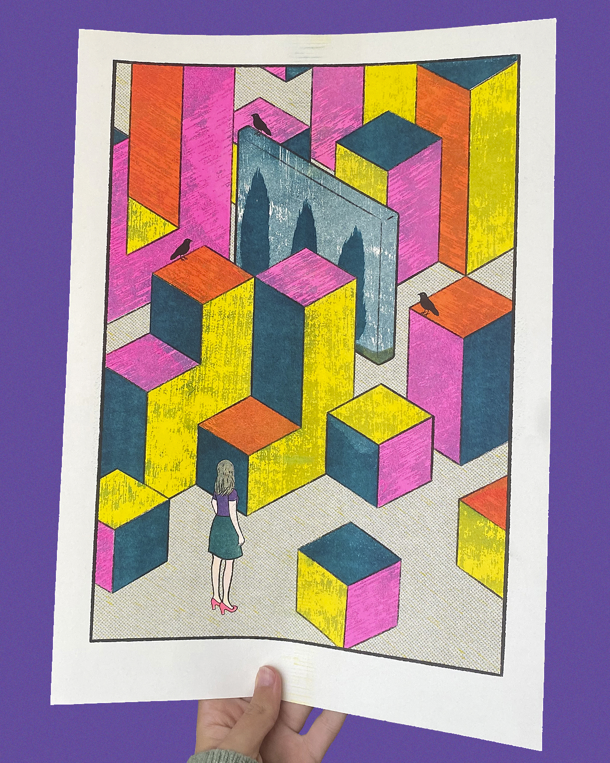 Risografia A3 de 4 cores (yellow, fluo pink, teal, black) em papel Natural Smooth da Fedrigoni de 170g.