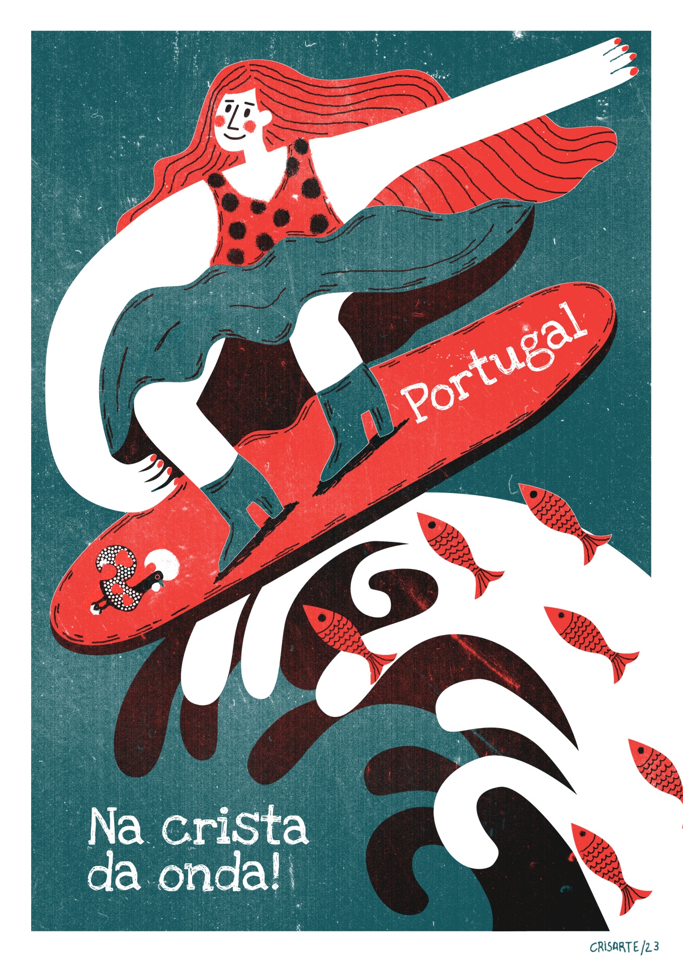 • Ilustração de mulher em skate vermelho com palavra Portugal e peixes vermelhos