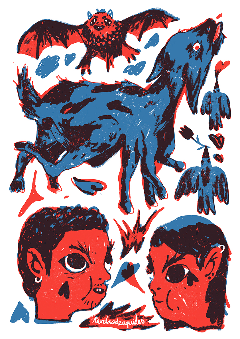 • Ilustração artística com morcego, cão e cabeças humanas em vermelho, azul e preto
