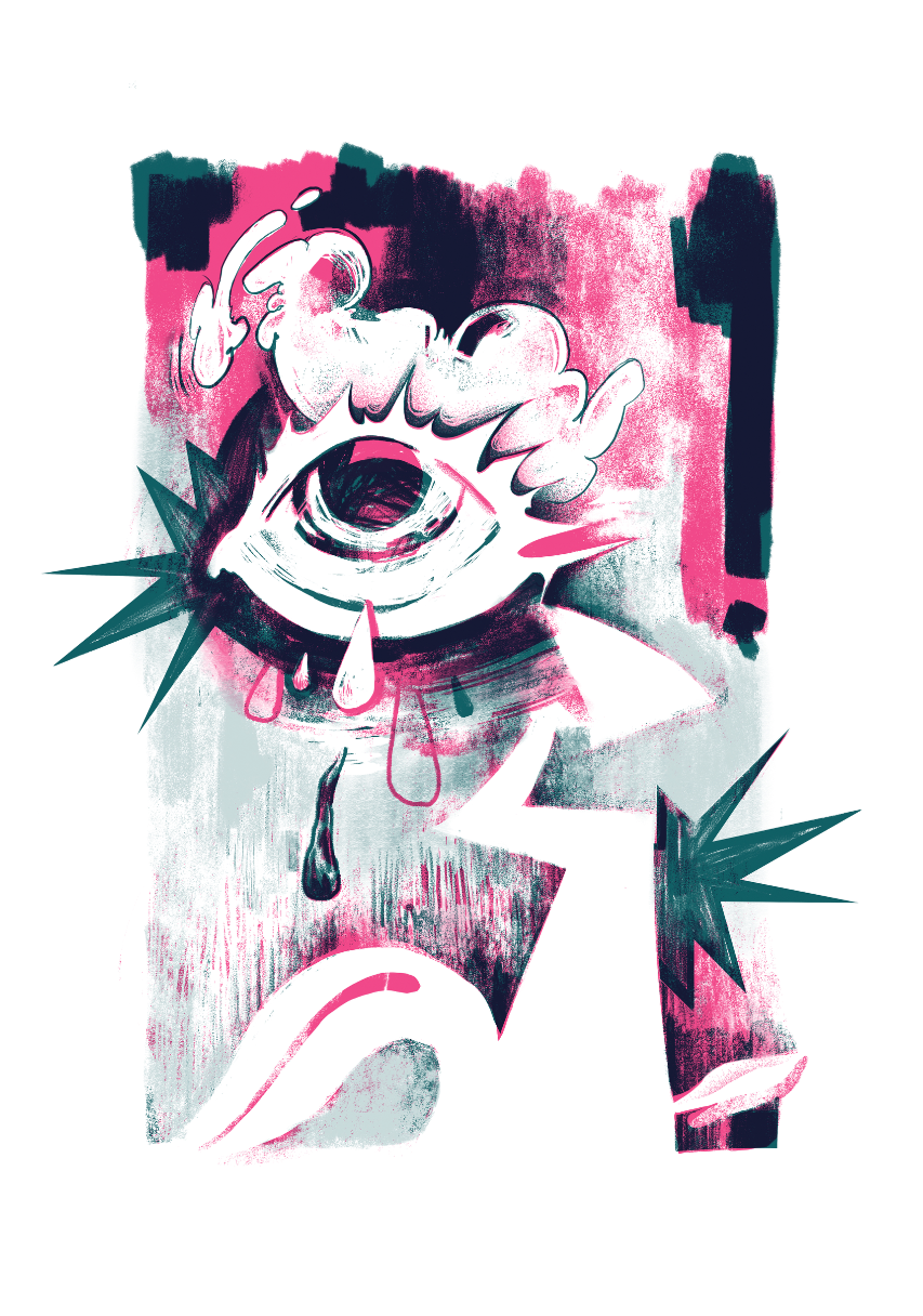 • Ilustração artística de um olho estilizado com lágrimas em tons de rosa e preto