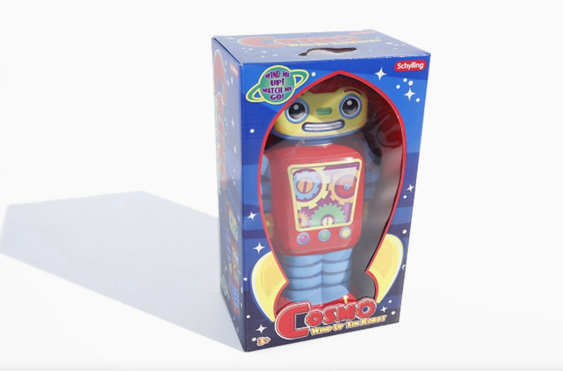 • Brinquedo robô em embalagem com estrelas e texto Cosmo