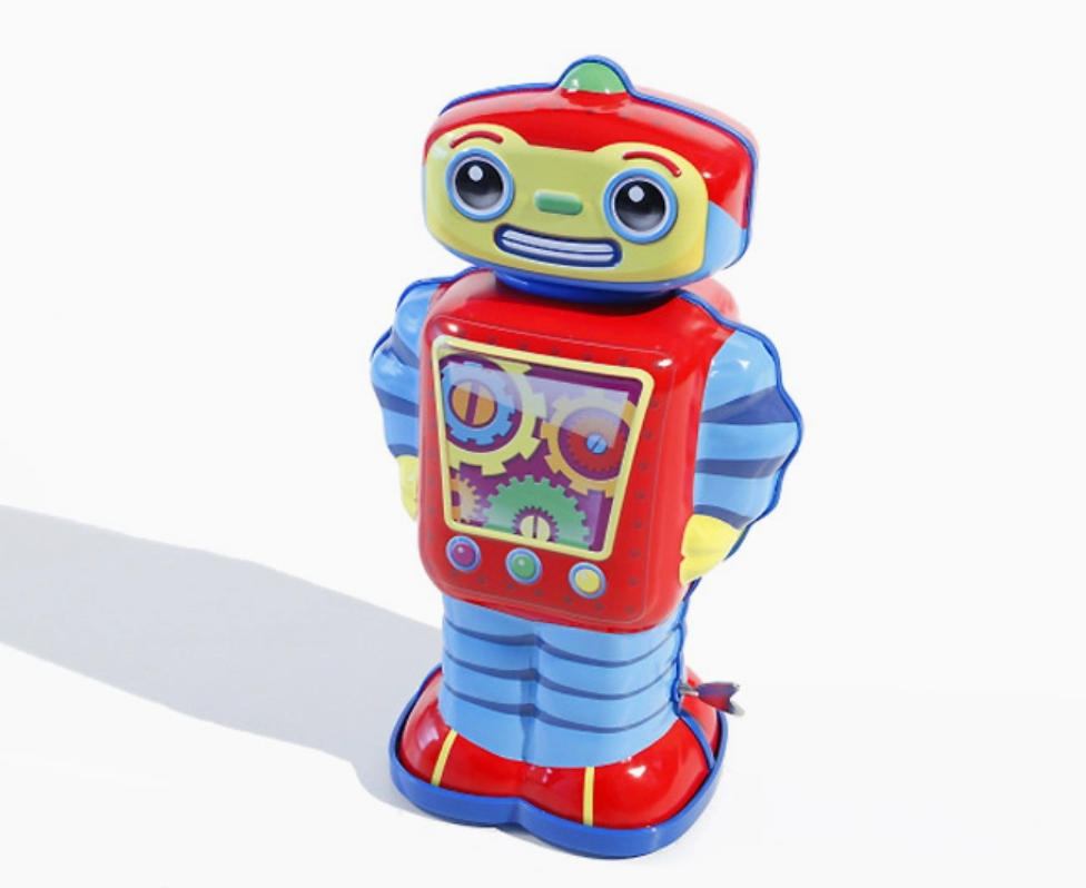 Robô de brinquedo colorido em metal sobre fundo branco