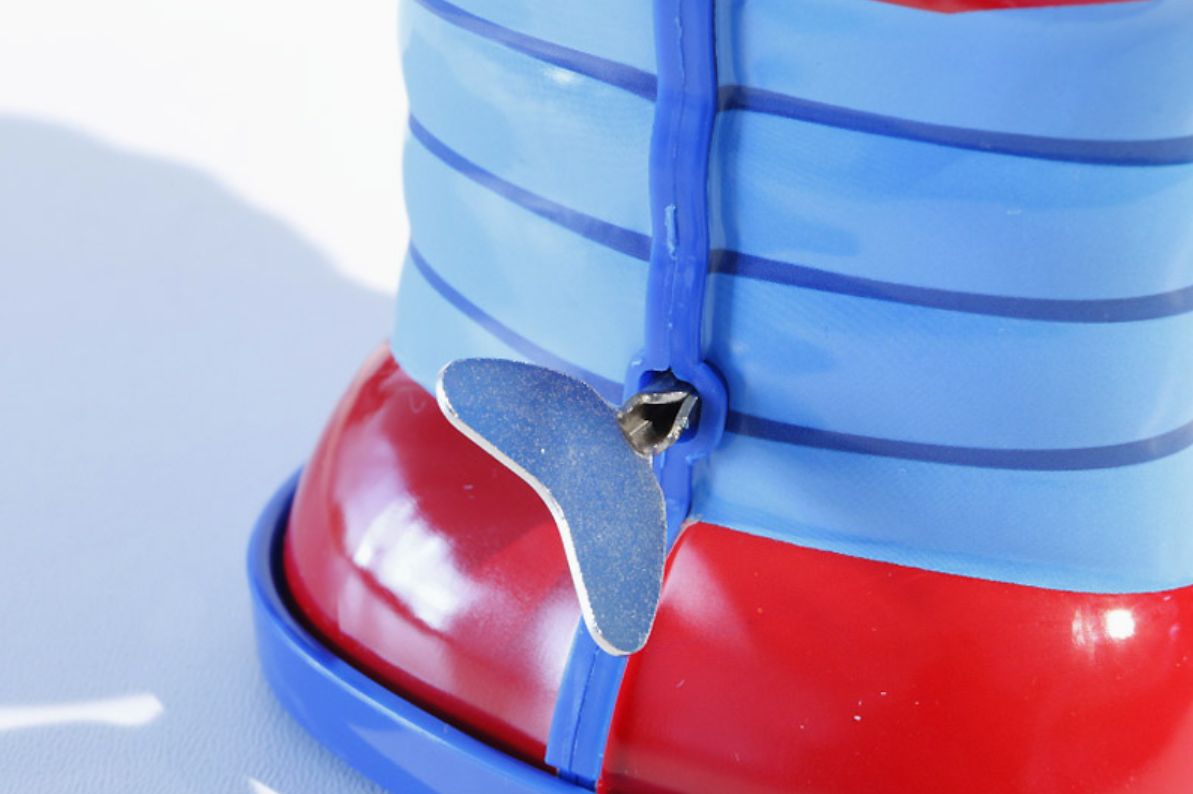 • caixa de música em forma de bota vermelha e azul com chave metálica pendurada