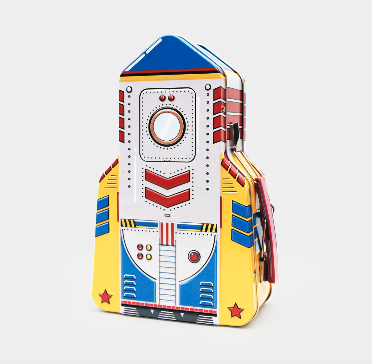 • Estojo metálico em forma de foguetão com padrões coloridos