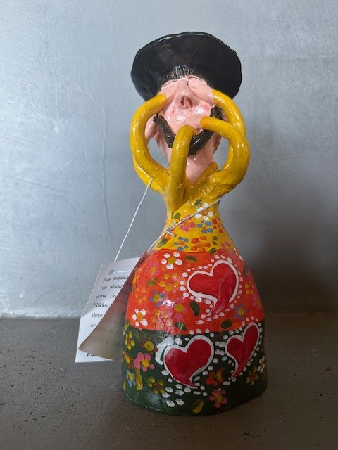 • Figura decorativa de cerâmica colorida com vestido e chapéu preto