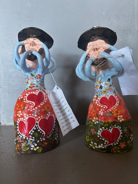 • Duas figuras de cerâmica pintadas à mão com vestidos coloridos e corações vermelhos, tocando instrumentos azuis e usando chapéus pretos.
