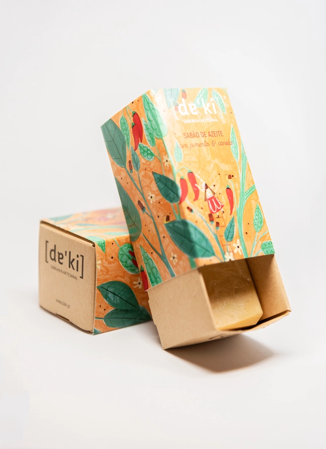 • Sabonetes embalados em caixas de papel decoradas com folhas e pimentos, um aberto mostrando sabonete bege