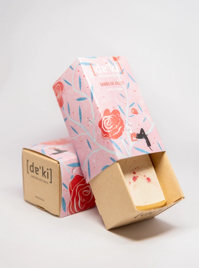 • Sabonetes em barra com embalagem rosa estampada com flores e folhas, etiqueta com texto [de'ki] e SABÃO DE ROSE número 4
