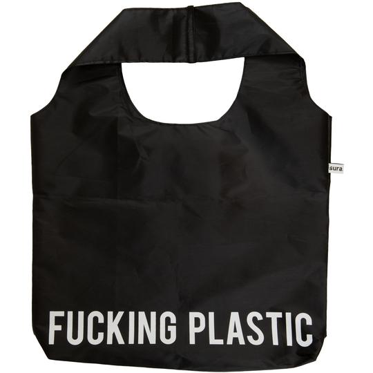 • Sacola preta reutilizável com texto branco Fucking Plastic.