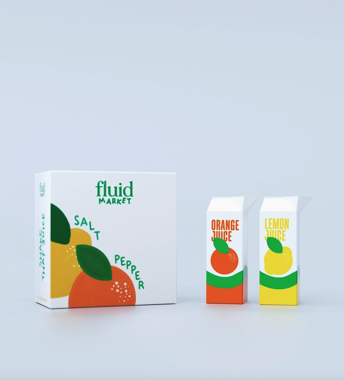 • Caixa branca de sal e pimenta com ilustrações de citrinos e duas embalagens cartonadas pequenas de sumo de laranja e limão