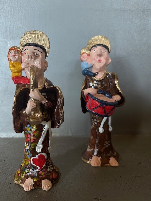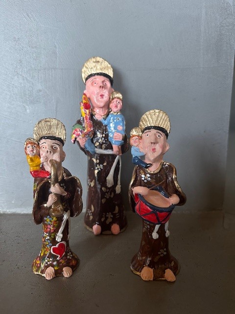 • Três figuras religiosas em cerâmica com crianças ao colo e instrumentos musicais