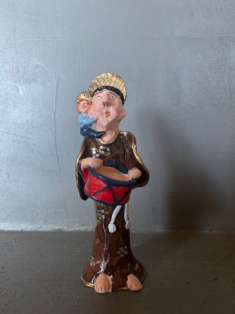 • Figura decorativa cerâmica pessoa a tocar tambor com criança ao ombro