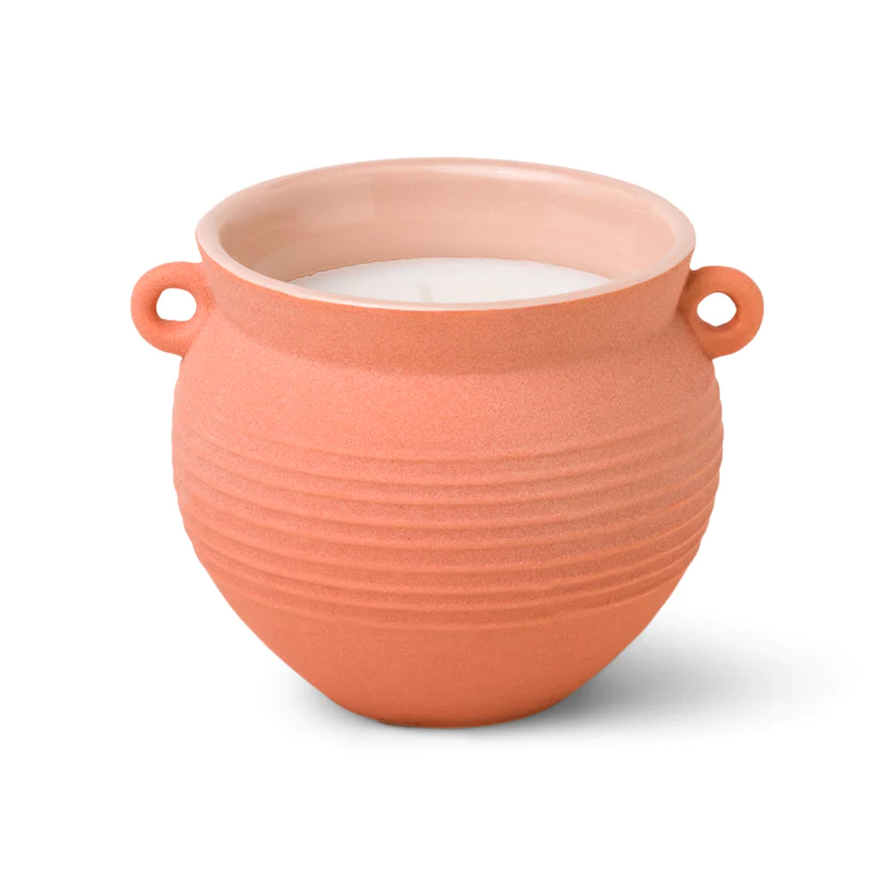 Escape to an island in the Aegean Sea with the Santorini collection. Influenced by timeless texture, this collection will transport you to a volcanic island of pure paradise. This 240g candle is hand-poured into a small pottery jug with handles and ribbed details that matches the style and scent of Santorini. After enjoying the Santorini-inspired scents, this unique vessel can be repurposed as a stylish storage vase.