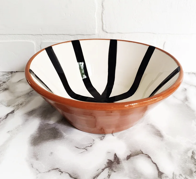 • Tigela de cerâmica castanha e branca com riscas pretas