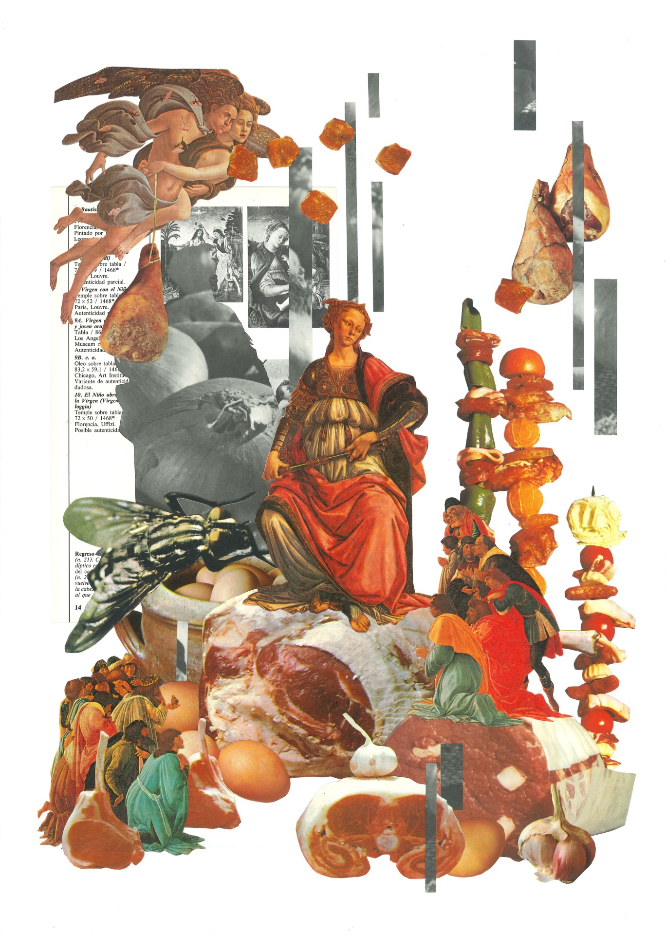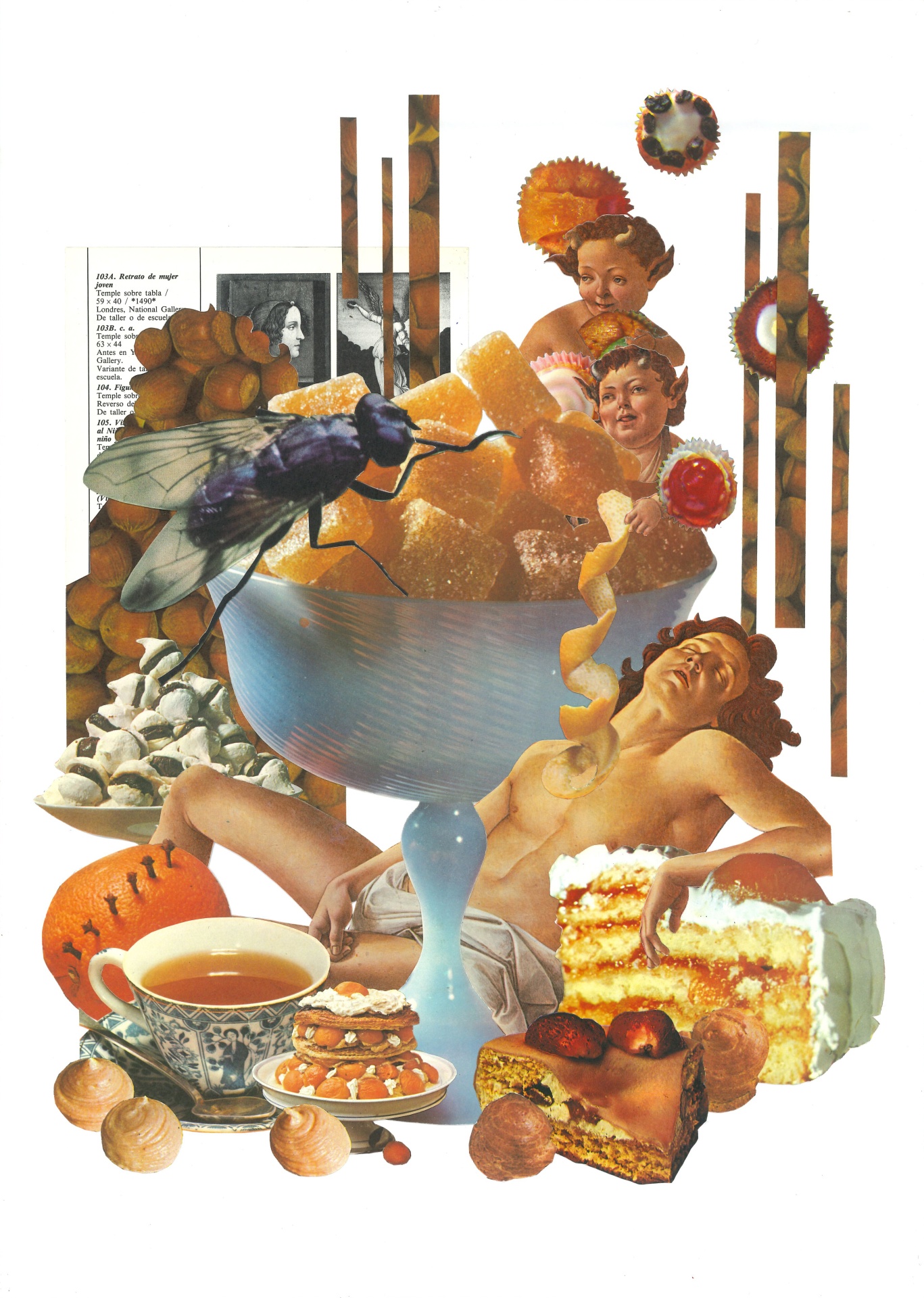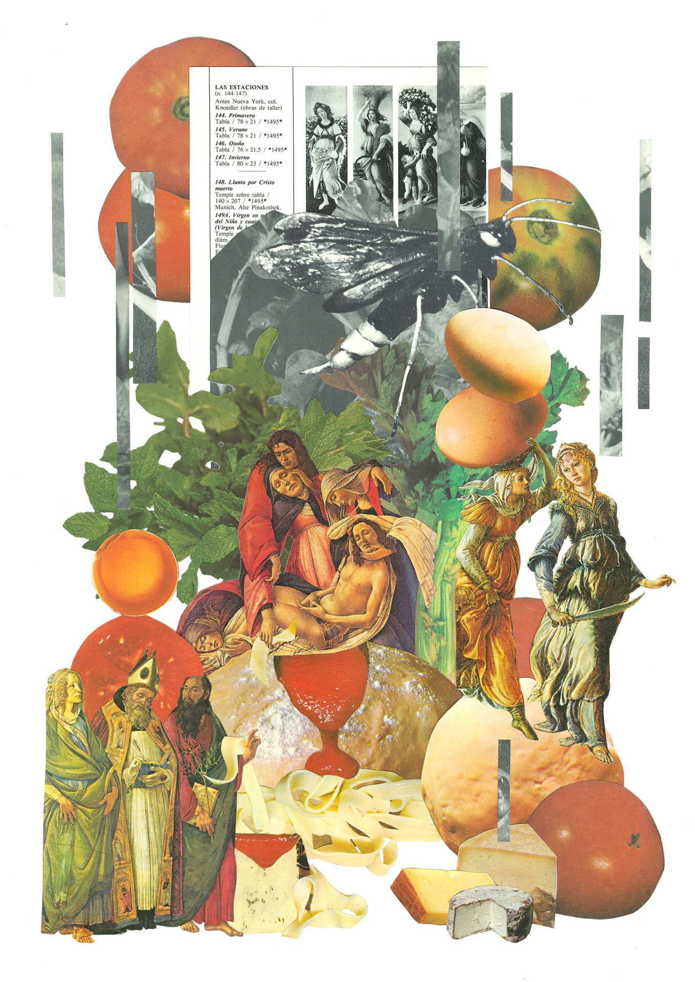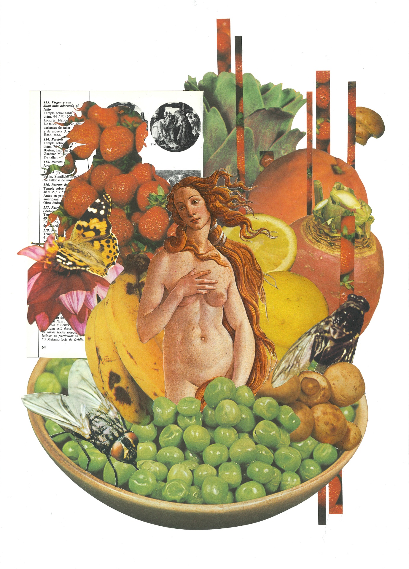 • Colagem com frutas, figura feminina, insetos e texto em papel