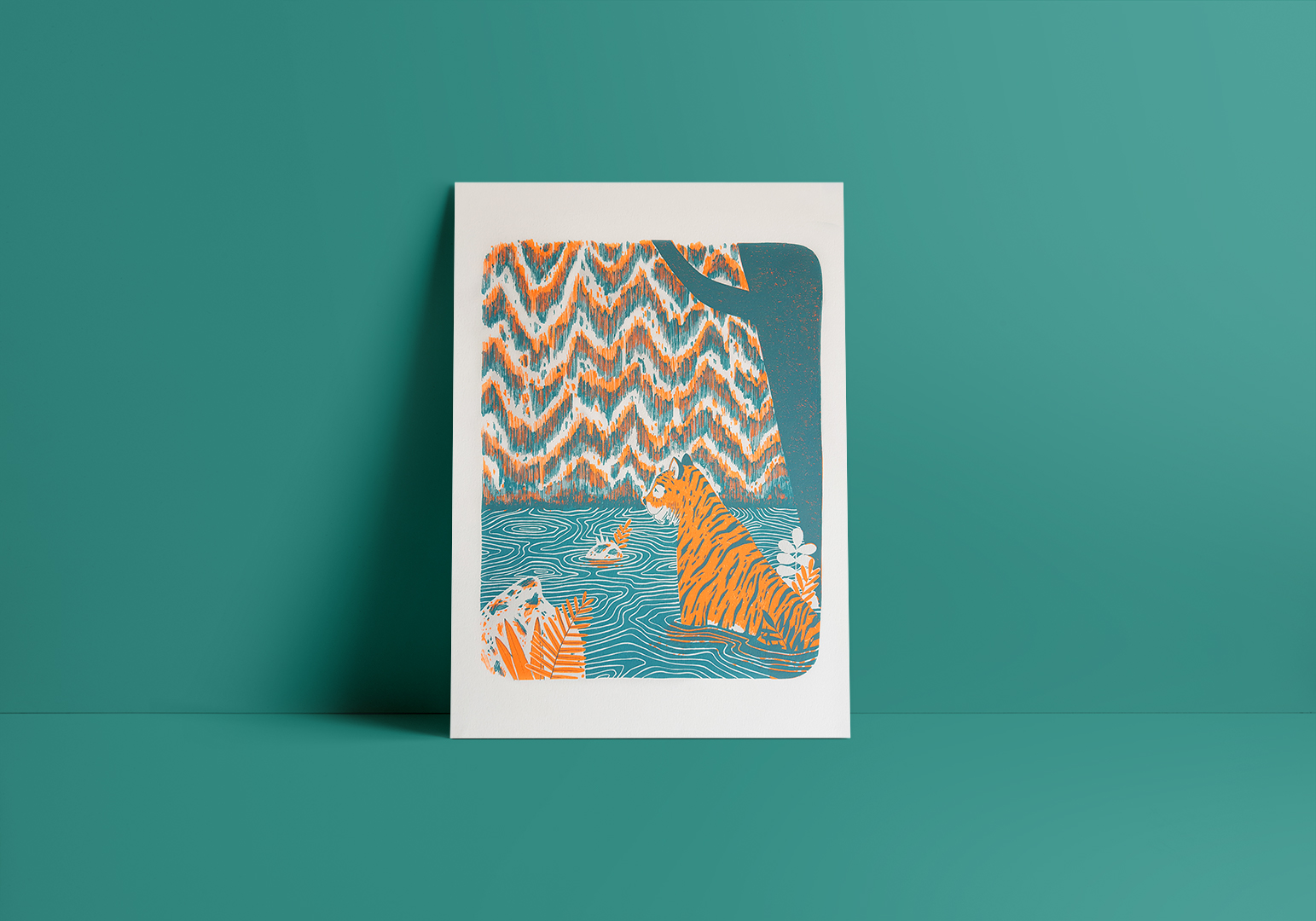 • Ilustração de dois tigres junto a um rio com árvores ao fundo, cores laranja, azul e verde