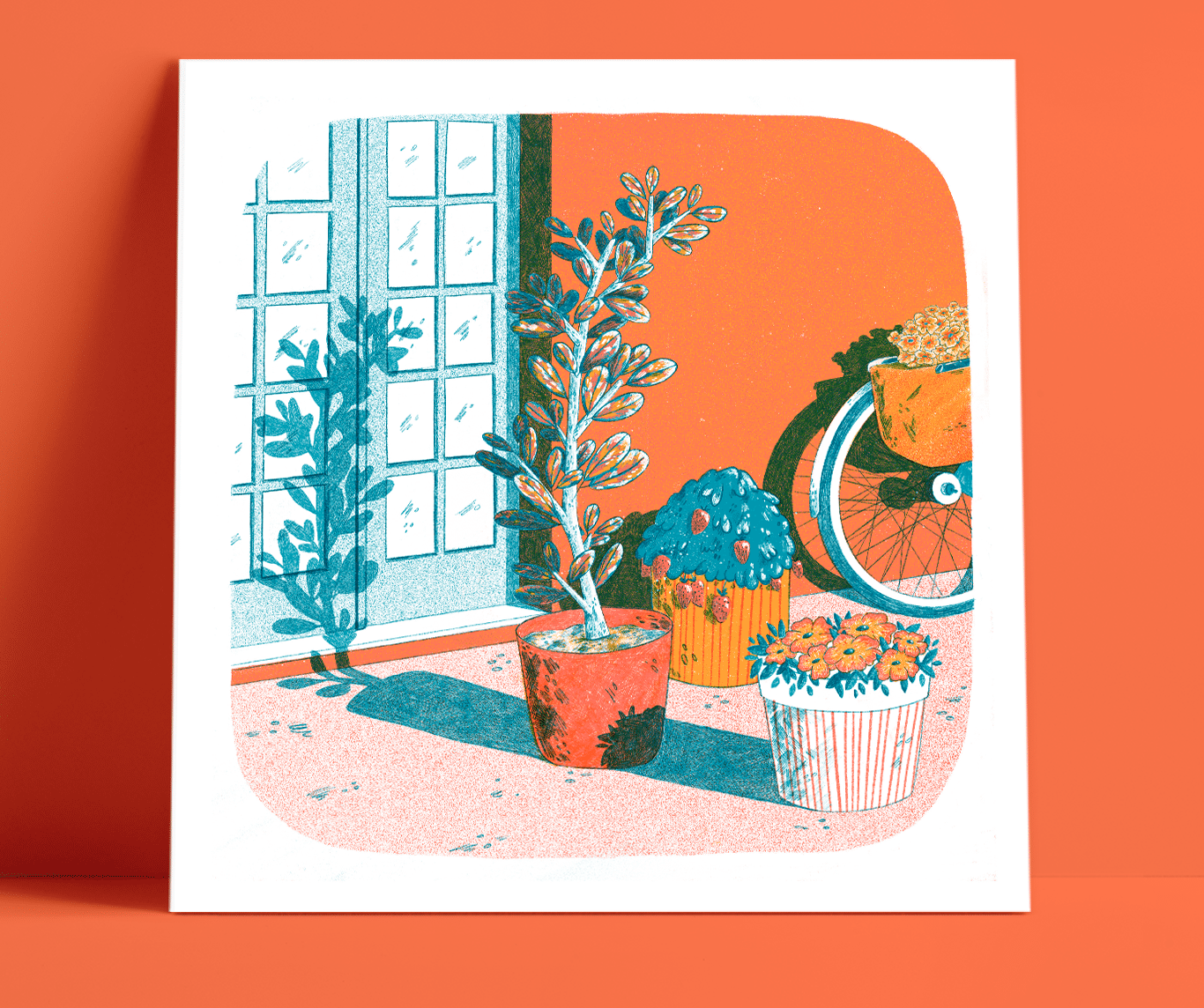 Ilustração colorida de uma janela, plantas, cupcake azul e bicicleta com flores