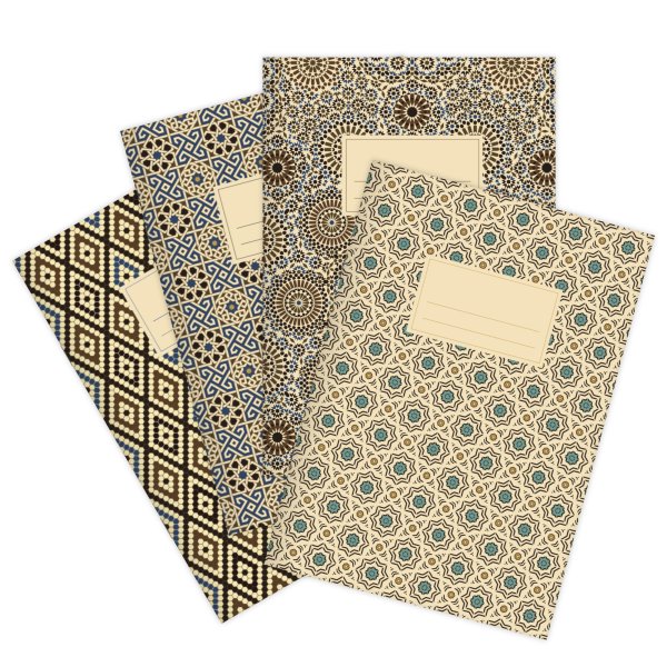 • Conjunto de quatro cadernos com capas em padrões geométricos coloridos