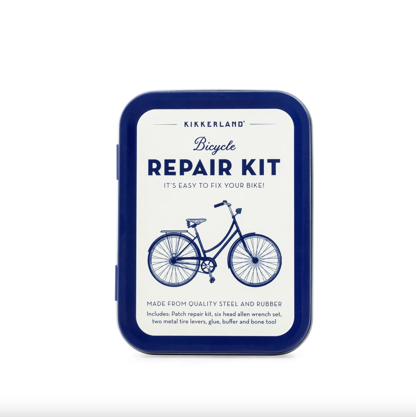 • Estojo de kit de reparação de bicicleta azul e branco com desenho de bicicleta e texto em inglês