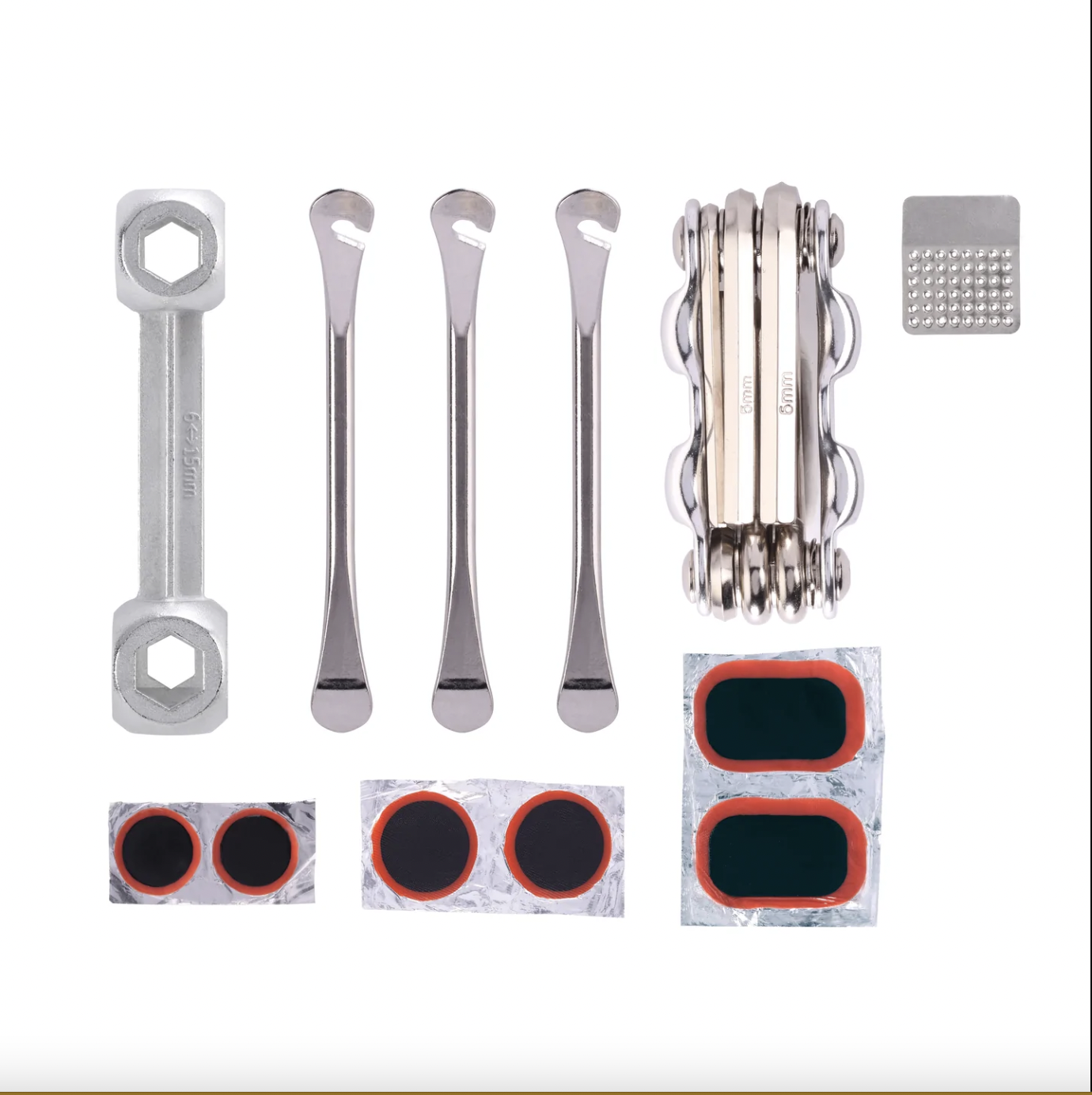 • Kit de ferramentas e remendos para reparação de pneus de bicicleta