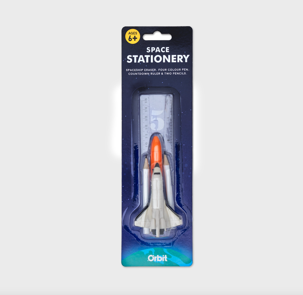 • Conjunto de papelaria Space Stationery com régua, borracha e lápis em embalagem
