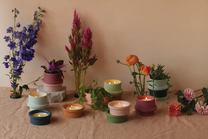 Calling all candle lovers with green thumbs! The Folia candle collection showcases two speckled ceramic vessels made to be combined into stackable, self-watering planters once the wax runs out. Mix-n-match to create a colourful planter and scent combination as unique as you are. Flip the dustcover to discover how to repurpose your candle in a few simple steps!