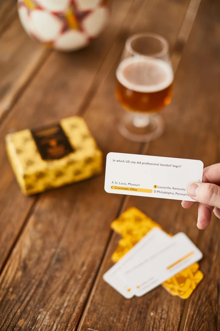 • Mão segurando carta de jogo de trivia com texto sobre baseball e várias cartas e uma caixa dourada com padrão ao fundo numa mesa de madeira, com uma taça de cerveja ao fundo.