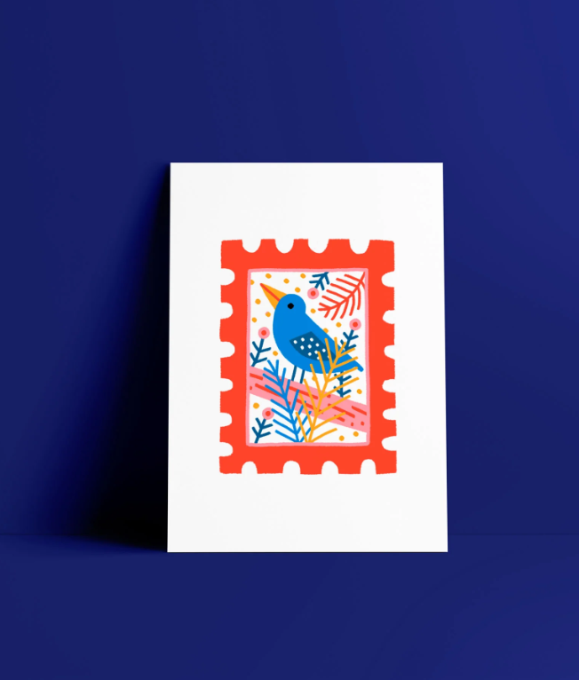 • Cartão branco com ilustração de selo postal com pássaro azul e plantas coloridas