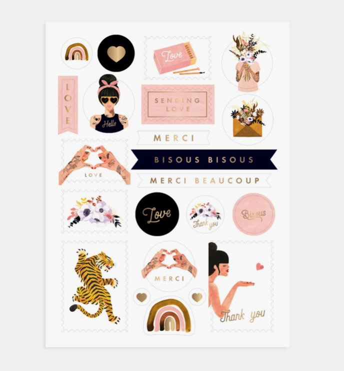 • Folha de autocolantes coloridos com flores, tigre, mãos a formar corações e textos como 'LOVE' e 'Merci'